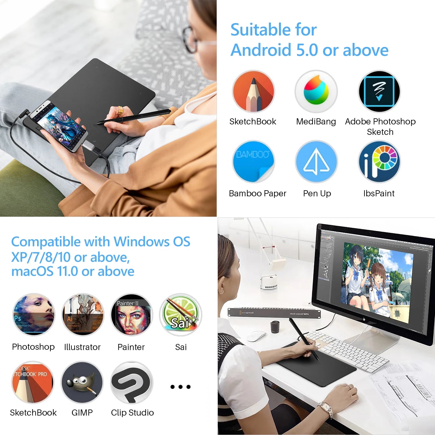 The FANGOR T605 Professional Drawing Tablet features a 6.69-inch drawing area and an 8192-level pressure-sensitive pen, supporting tilt sensing and a 330PPS reading rate for smooth and precise drawing. The battery-free pen design ensures it's always ready to use, while 6 customizable shortcut keys enhance creative efficiency. Compatible with Windows, Mac, and Android systems, it is widely used in design, painting, animation, education, and more, making it an ideal choice for both professional artists and amateurs.