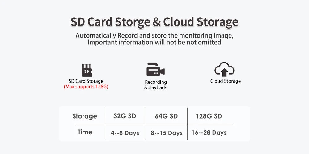 *Support SD card storage and cloud storage, SD card supports up to 128G,cloud storage (need to purchase in iCSee app), data security is more stable 1 times.