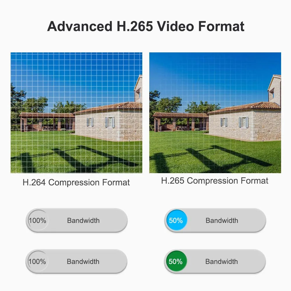 * This camera uses H.265 image encoding and decoding. Compared with traditional H.264, it has the advantages of fast loading speed, small space occupation and less bandwidth resources, which can save you storage costs.