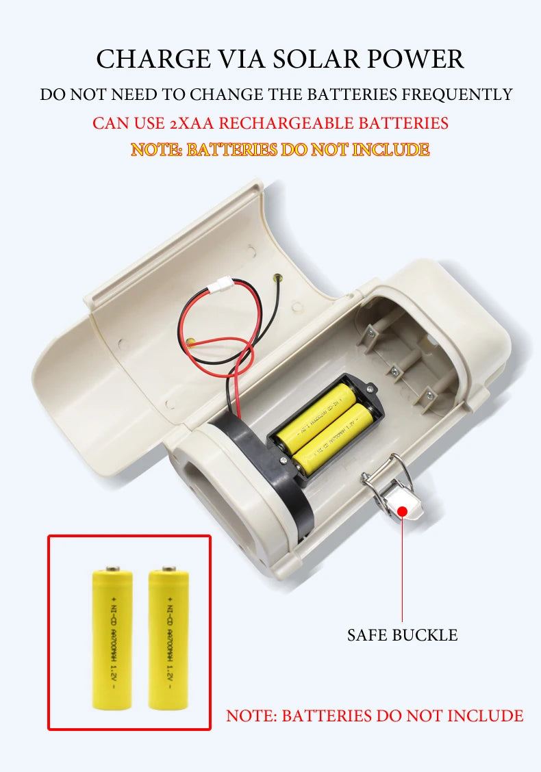 - Solar powered, can use 2x AA rechargeable batteries, no need to change the batteries frequently (Note: Batteries are not included)